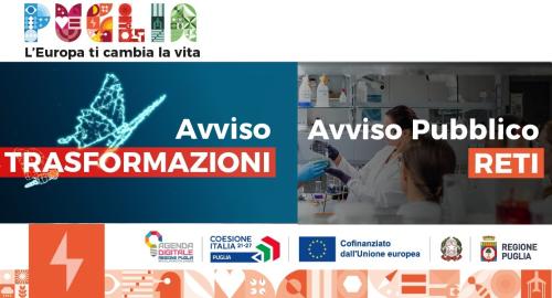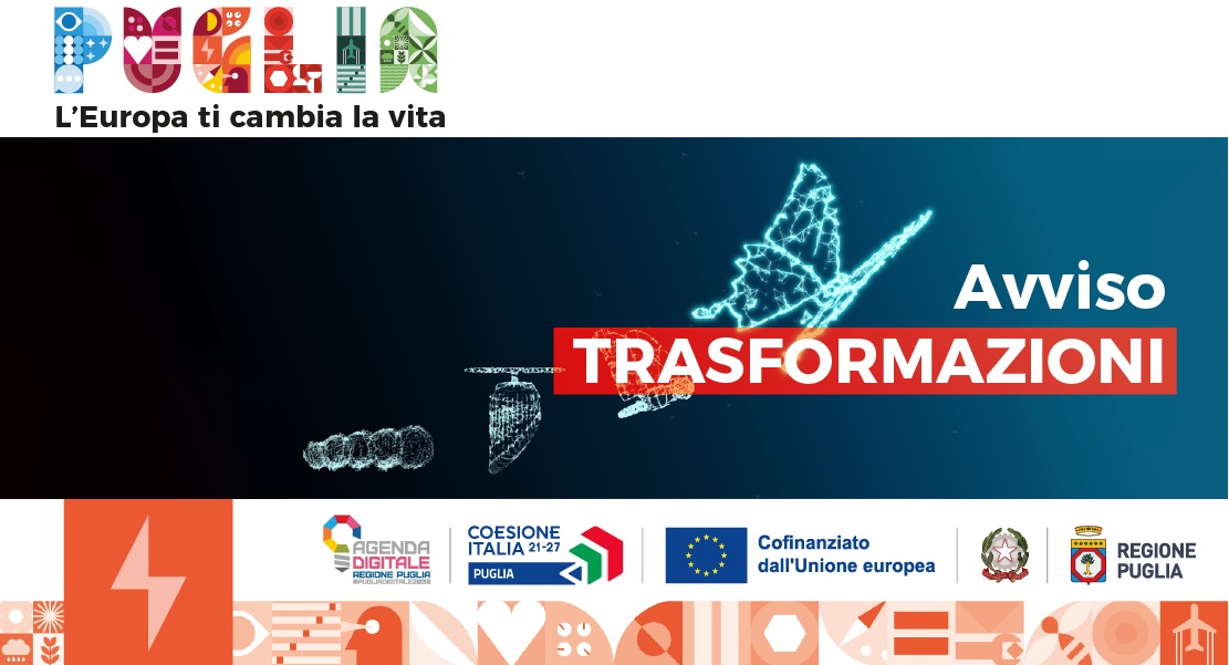 Con Determinazione della Sezione Crescita Digitale delle persone delterritorio e delle imprese n. 64 del 24 Giugno 2024, pubblicata sul BURP n. 52 del 27 Giugno 2024, è stato approvato l' Avviso pubblico TRASFORMAZIONI “Servizi per l’innovazione e l’avanzamento tecnologico e interventi di trasformazione digitale a supporto delle PMI” e relativi allegati, per la realizzazione di progetti di investimento volti all’innovazione delle PMI in termini di transizione ecologica e trasformazione digitale, attraverso aiuti mirati finalizzati all’utilizzo ed alla diffusione di servizi digitali innovativi.